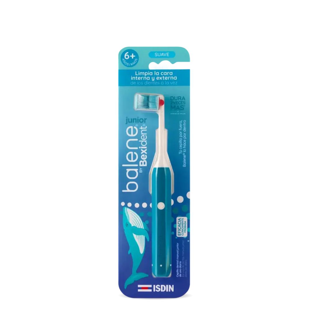 Balene by Bexident Júnior Azul, escova de dentes diária que limpa a face interna e externa dos dentes em simultâneo. As suas cerdas de última geração duram o dobro das de uma escova de dentes convencional. Indicada dos 6 aos 11 anos.